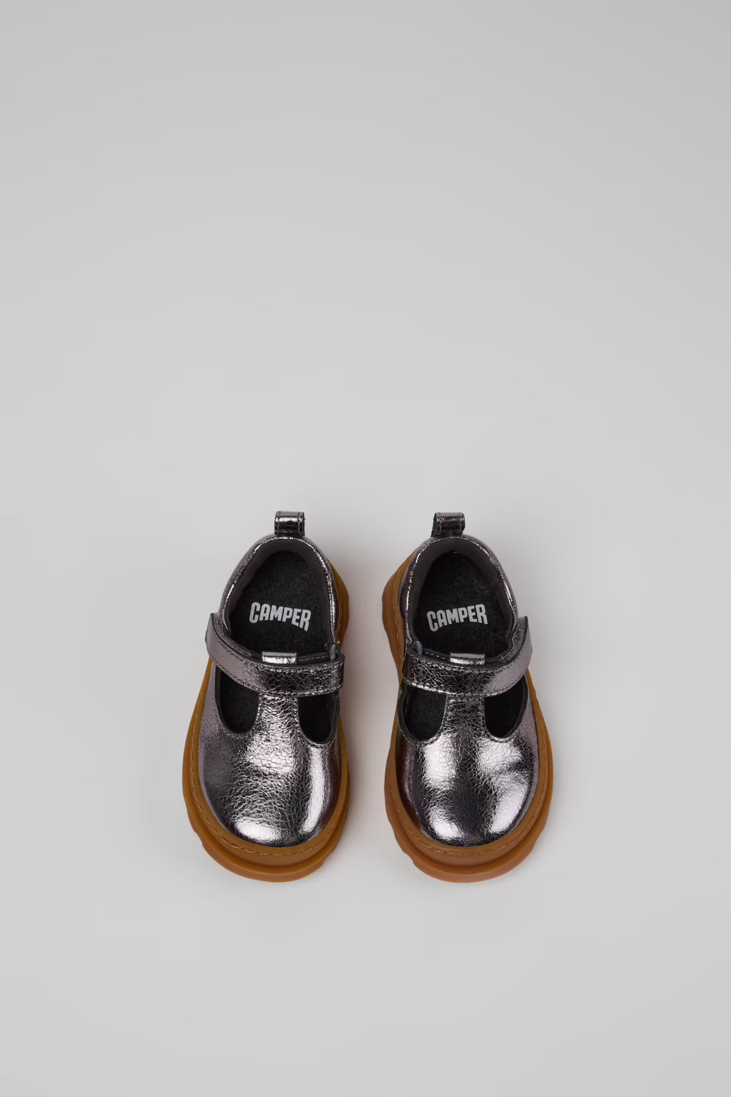 Silver calfskin leather kids' shoes with OrthoLite® Recycled™ footbeds, hook and loop closing system, and rubber outsoles (20% recycled).