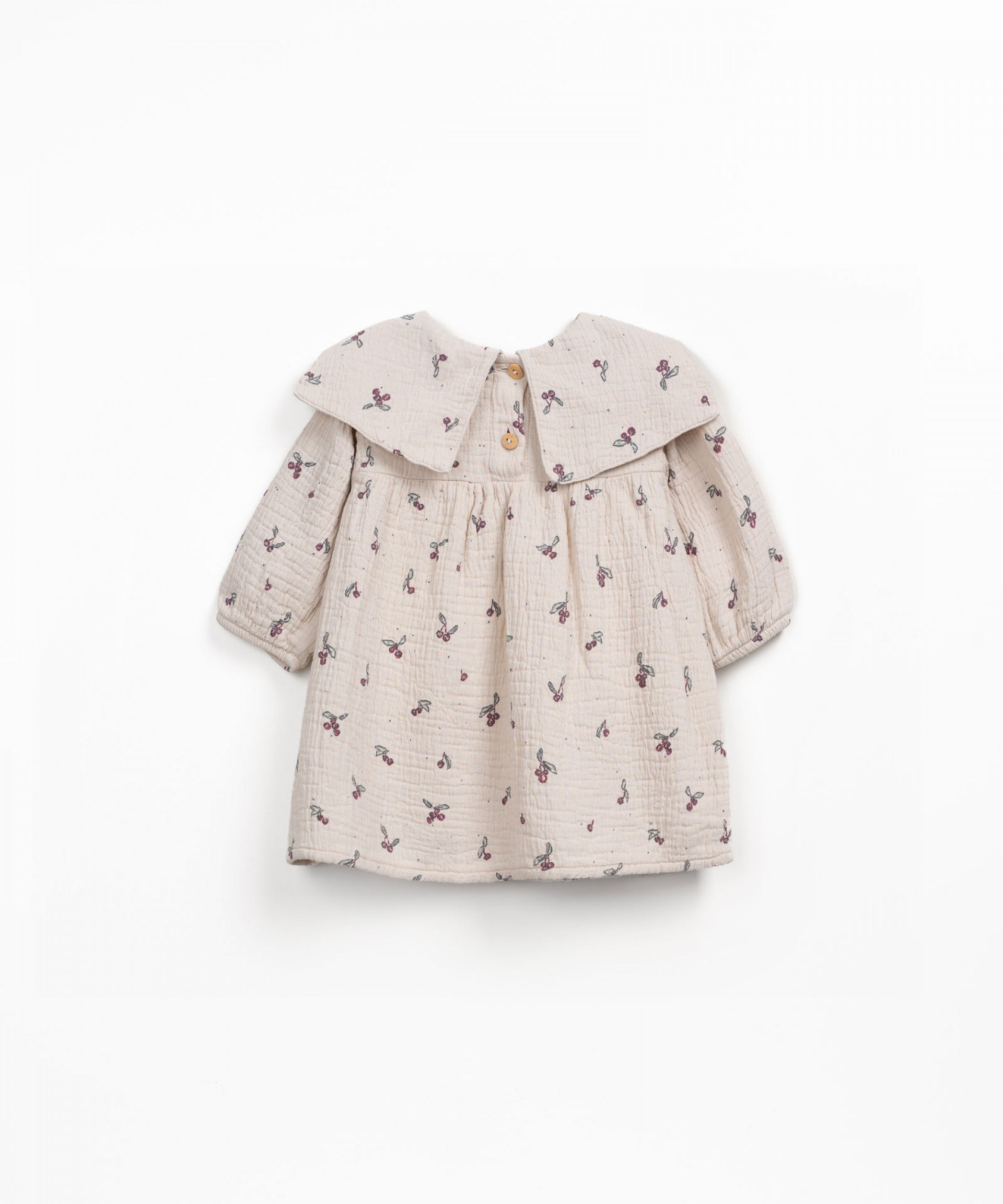 This dress is made of cotton fabric, in Cru color. It is a long sleeve model, with applied collar, front coconut button, and our strawberry tree print.