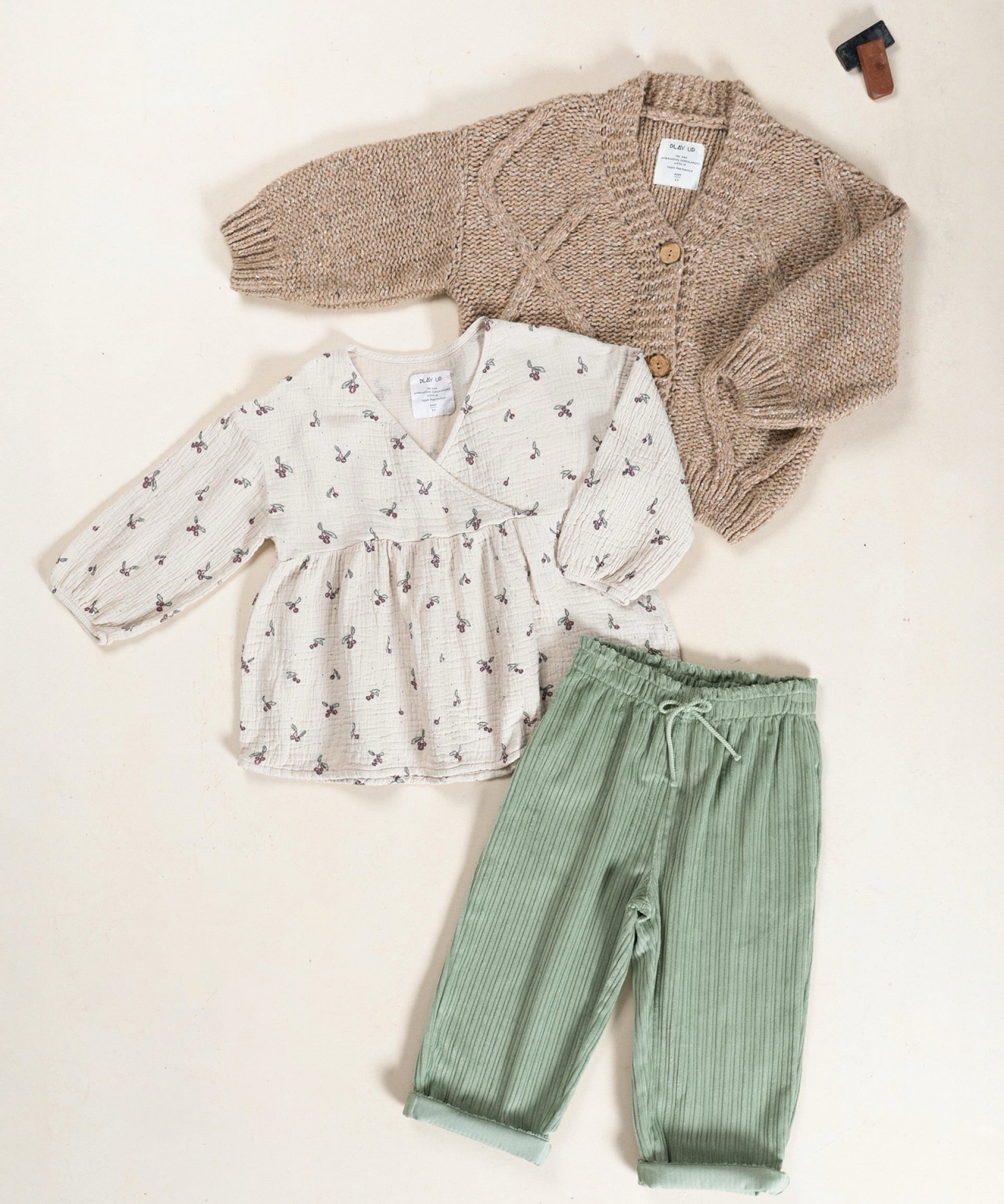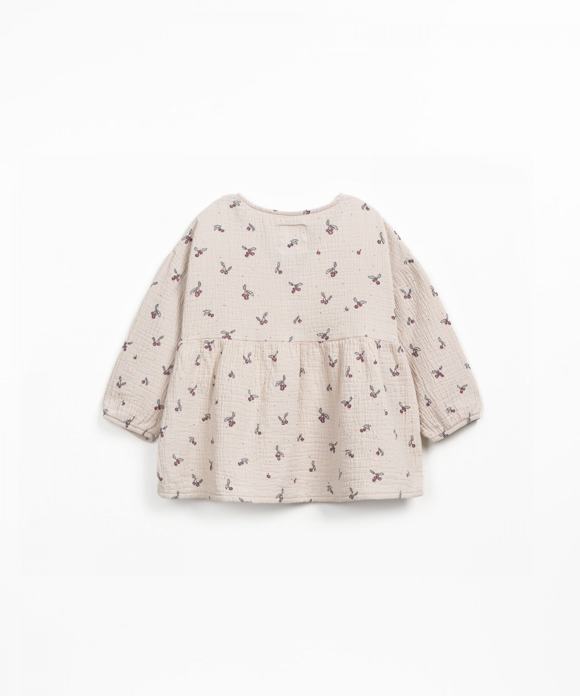 This tunic is made of cotton fabric, in Ecru color. It features long sleeves, a V-neckline with wrap-over design, and our medronho berry print