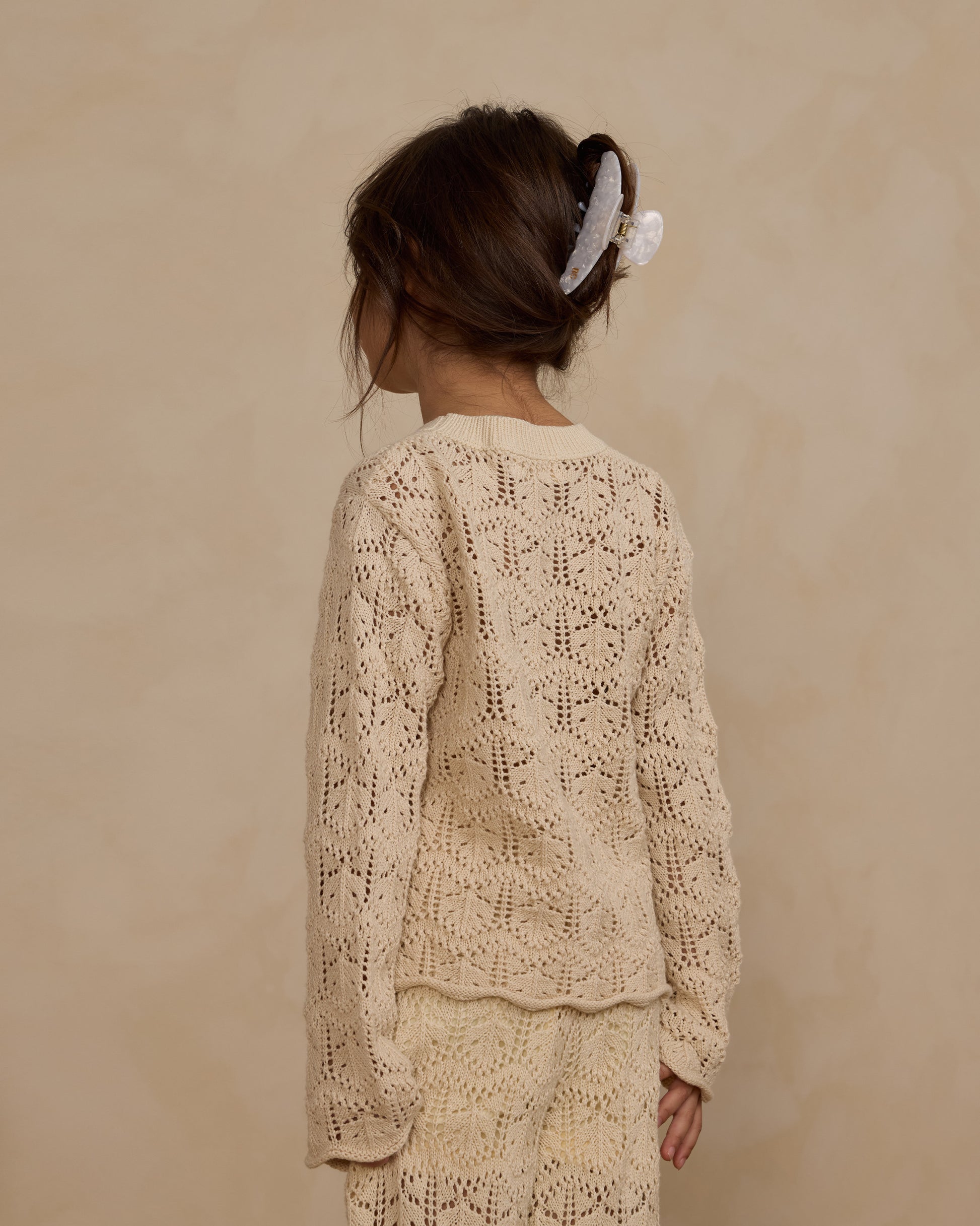 Our Crochet Knit Pullover has a ribbed neckline, a scallop knit hem and scallop sleeves. A stylish look, paired perfectly with our Crochet Knit Pants.
