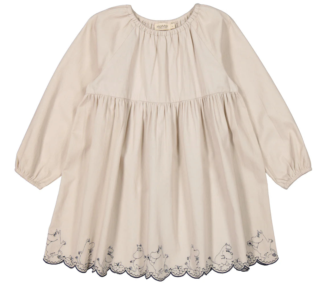 Long-sleeved dress with good volume. The dress has fine wavy edges and embroidered Moomin details at the bottom. The length of the dress goes above the knee.