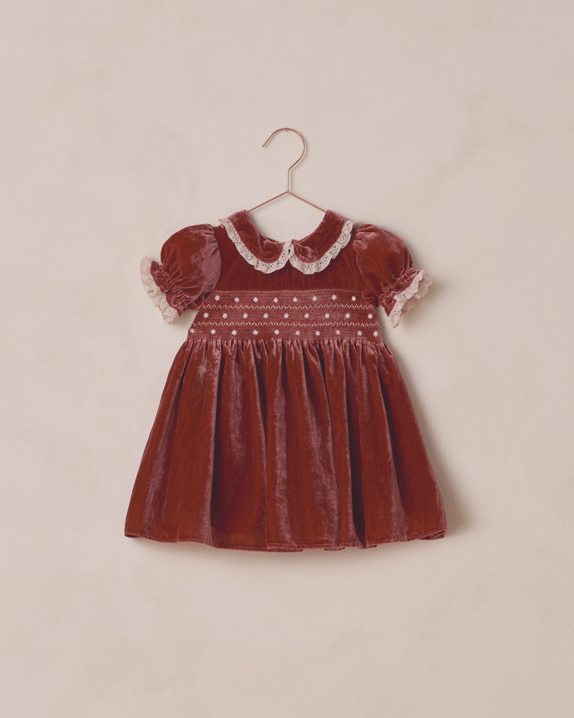 The Elizabeth Dress features a smocked bodice with dainty embroidered details, puff sleeves with lace trim, and a scalloped lace Peter Pan collar. Crafted in soft velvet, this timeless silhouette evokes a sense of tradition and nostalgia, making it the perfect keepsake dress for special occasions and holiday gatherings.