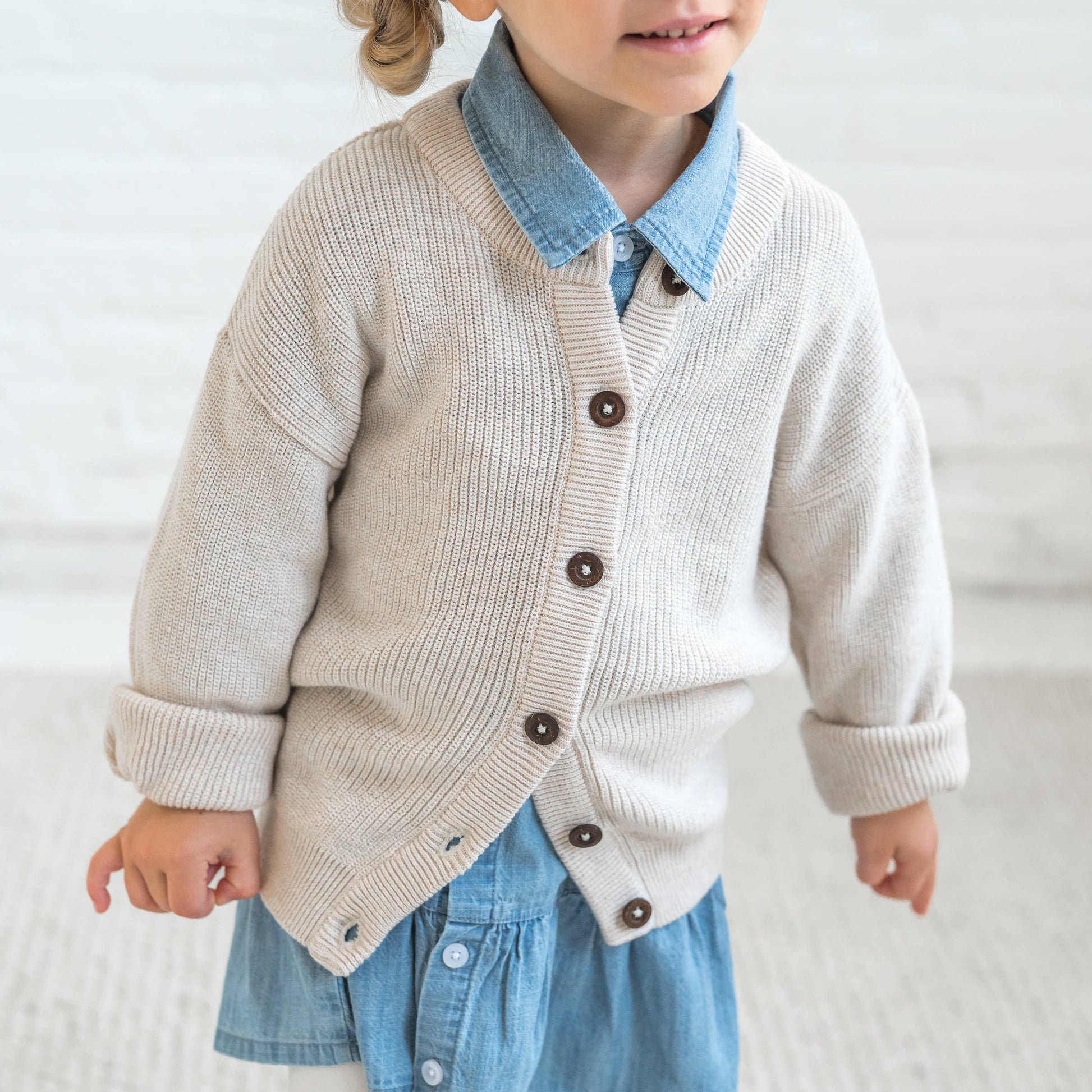 Stay warm and stylish with the Ellis Cardigan Stitch Knit Cardigan, perfect for those chilly fall and winter days. This charming cardigan features a classic rib cardigan stitch and a relaxed fit, making it a great layering piece for any outfit. The button closure allows for easy dressing, while the low power Lycra at the rib edges provides extra flexibility. Ideal for both casual and dressy occasions, the Ellis Cardigan is a versatile and essential addition to your child's cold-weather wardrobe. Made of 100% Organic Cotton Water-based dyes ensuring long-lasting color vibrancy and durability Sustainably sourced and ethically produced Naturally hypoallergenic Machine Wash Cold, Tumble Dry Low