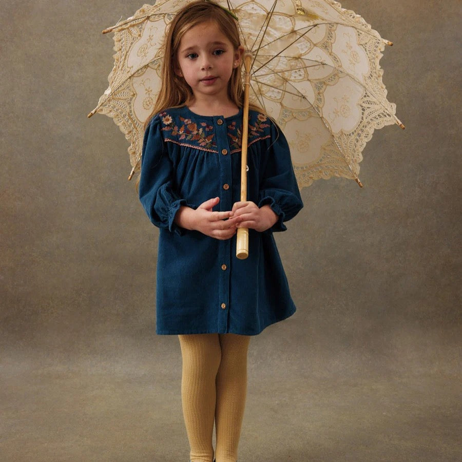 Solid Color Corduroy Dress. Floral embossed embroidery in velvet thread, handcrafted using a thread embroidery machine. Rickrack details under the breastplate. Buttoned at the front from top to bottom. Elasticized, ruffled cuffs. Set of gathers for a pretty volume.