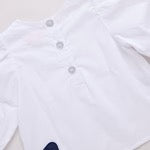 Picture Perfect! The Dana Bow Top has a unique style, with its elbow length puff sleeve, three silver glitter buttons at the back and a navy poplin box applique at the bottom. Top has a shirttail cutout as so it can be worn tucked in or out. The Girls Gianna Skirt turns up this Fall in a vibrant Red Blue Check that's perfect for the pep rally and the school dance! This fully gathered skirt is accented by a pattern on pattern ruffled trim at the elastic waist.
