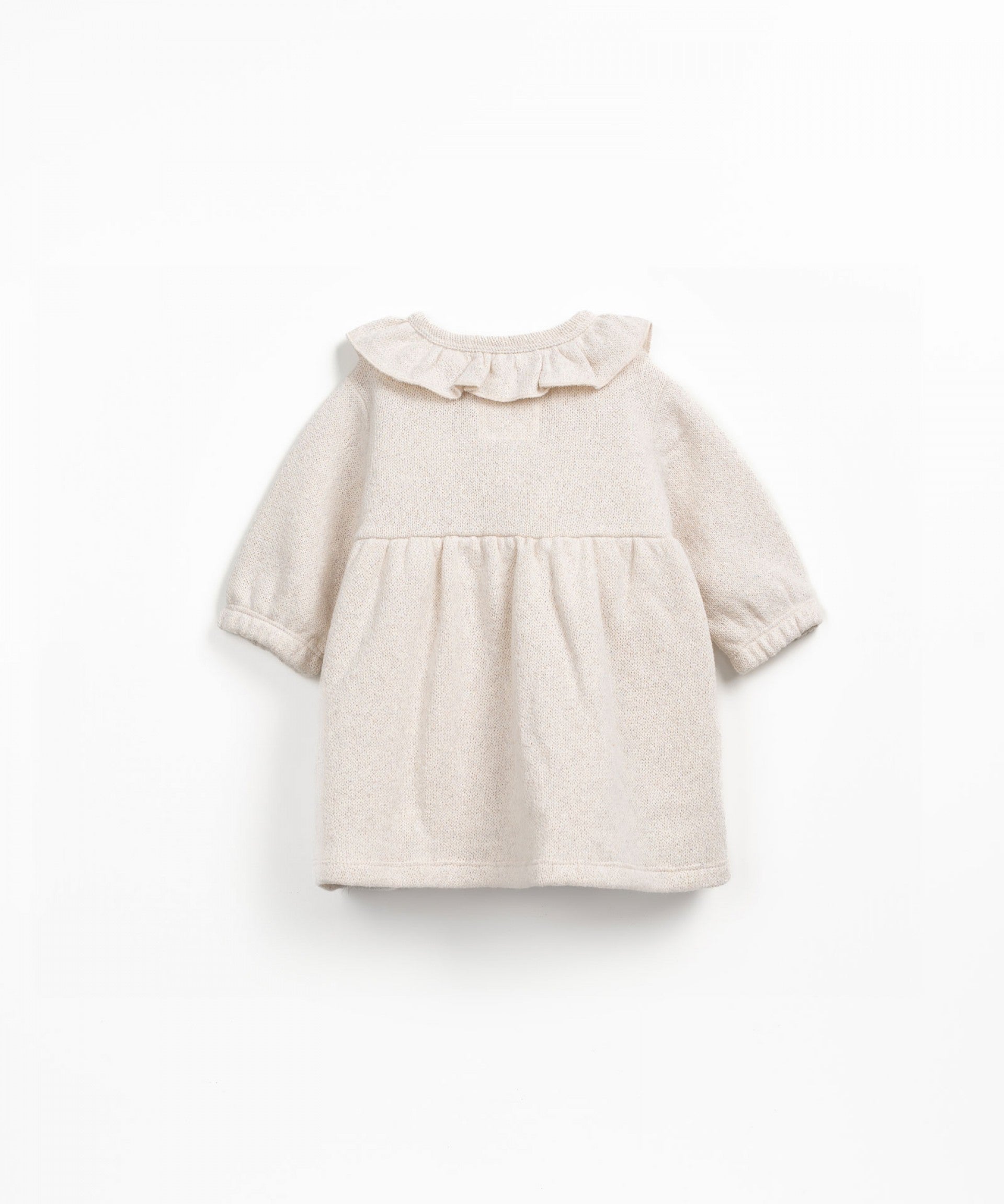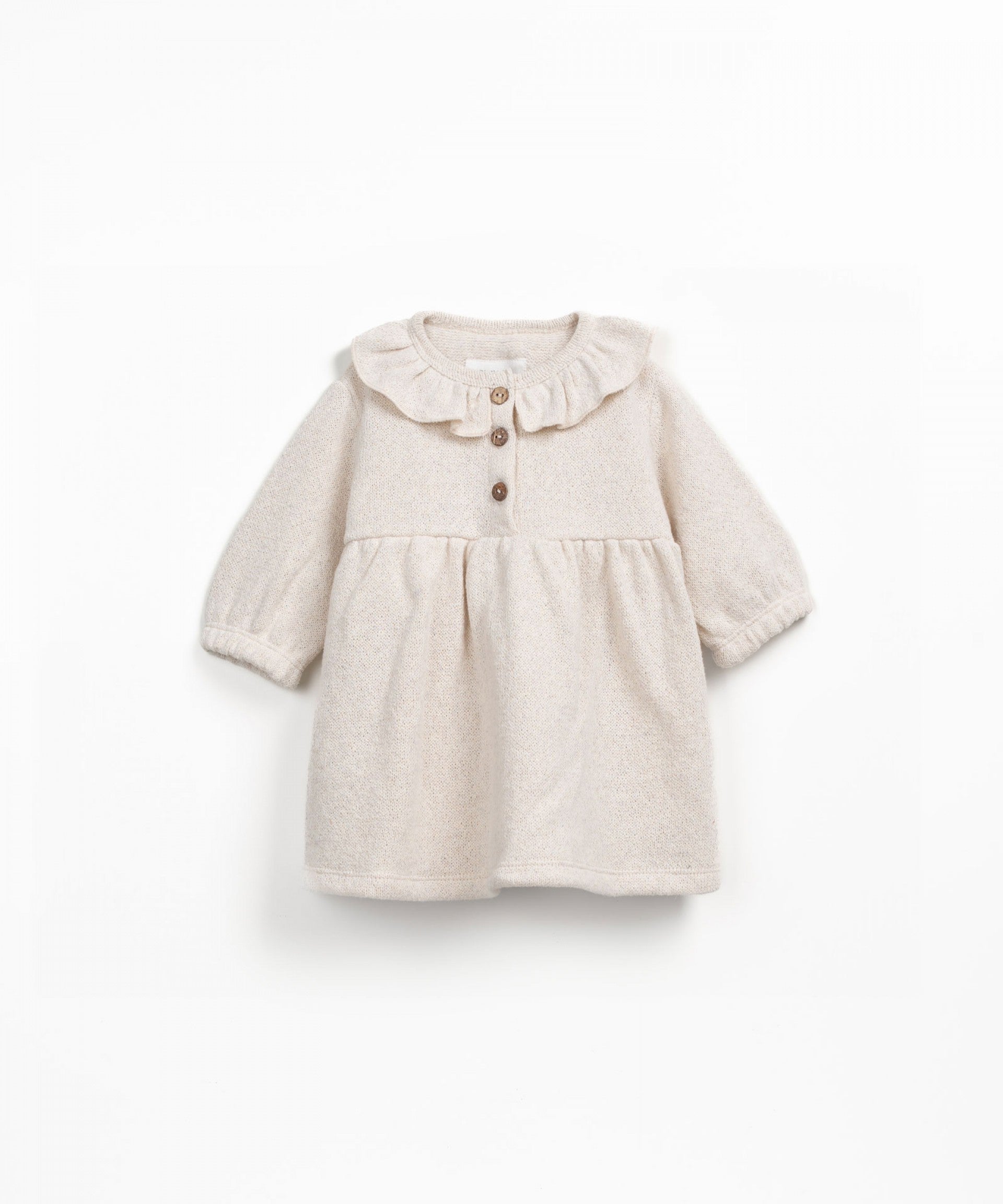 This dress is made from jersey with a blend of regenerative cotton and recycled cotton, in the color Off White. It features long sleeves with elastic cuffs, a collar detail, and a front opening with coconut buttons.