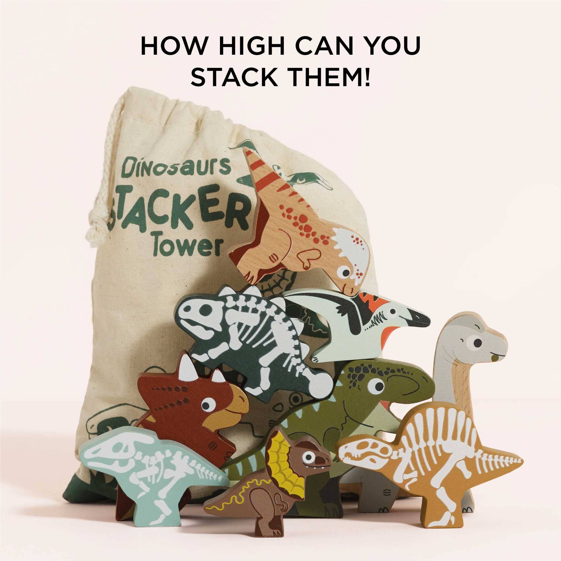 This 9-piece set, complete with a cotton drawstring bag, will captivate little ones for hours. These stacking dinosaurs offer double the fun with their unique design. One side showcases highly detailed painted dinosaurs, while the other side reveals an intricate fossil. Let your child embark on exciting adventures by stacking and balancing these pieces as highly as their skills allow and watching them topple down. Watch imagination soar and curiosity ignite, as little ones explore the prehistoric world of dinosaurs through play.