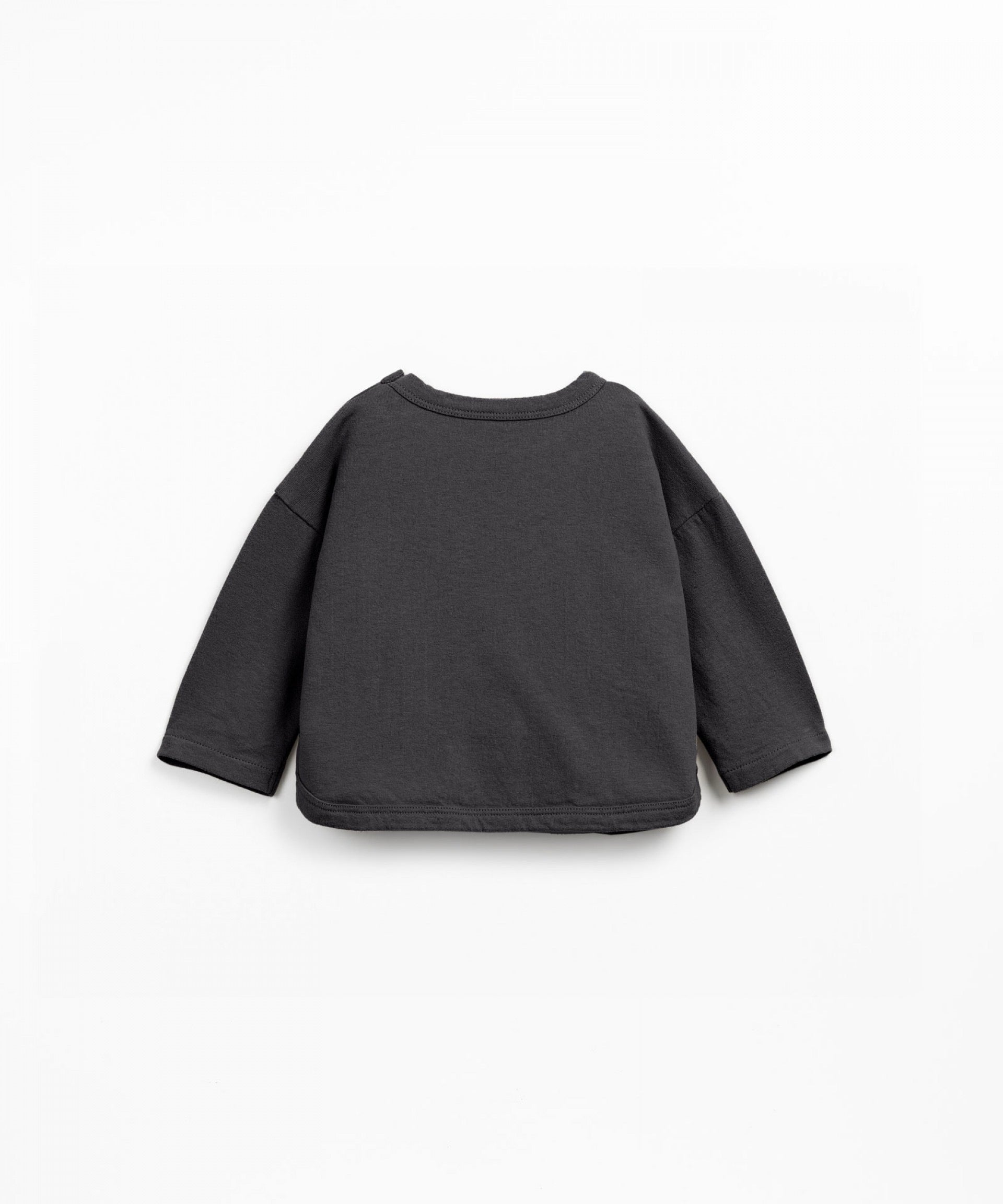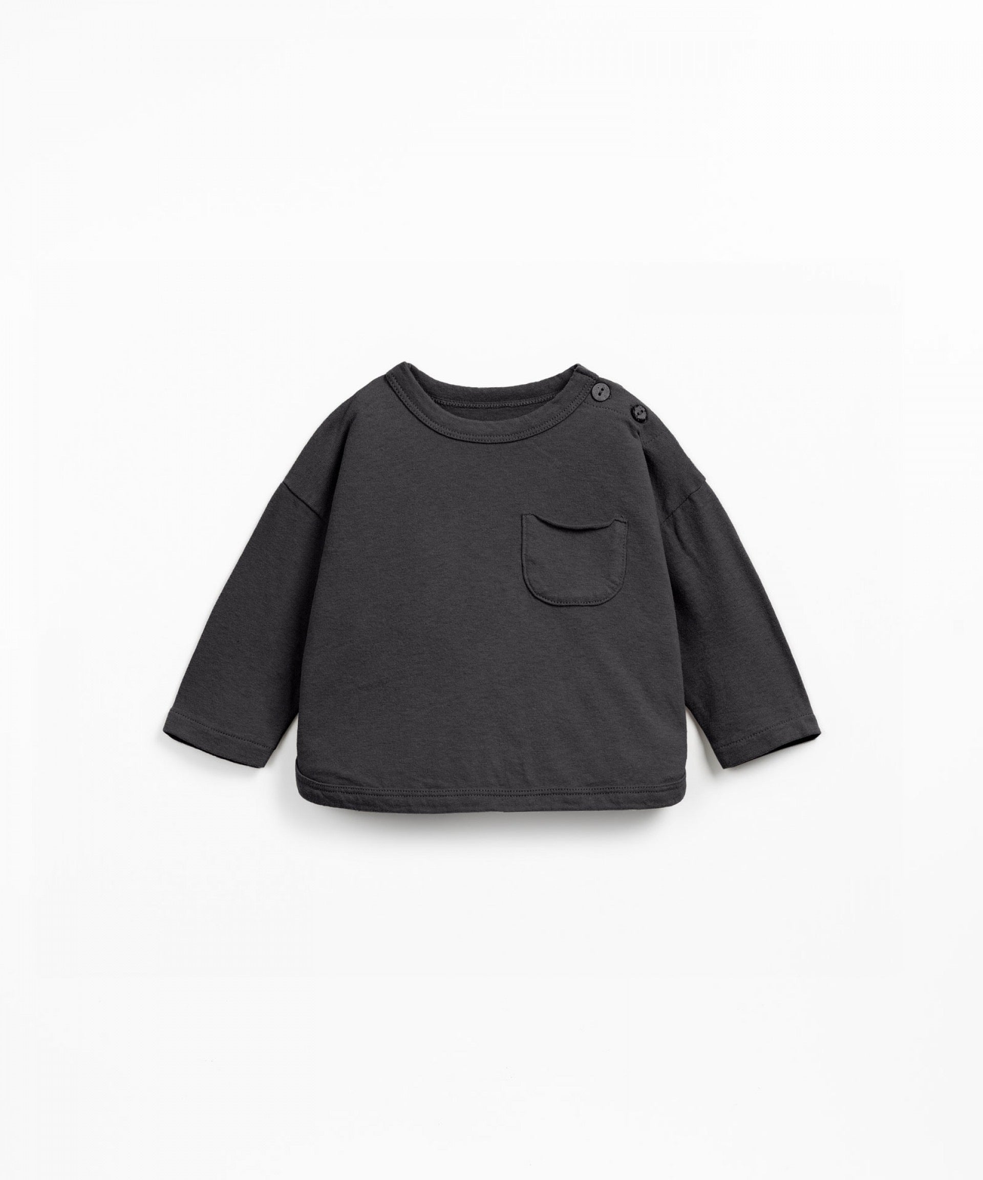 This T-shirt is made from knit fabric with a blend of organic cotton and recycled cotton, in Dark Grey color. It features long sleeves, a chest pocket, and a shoulder opening with coconut buttons.