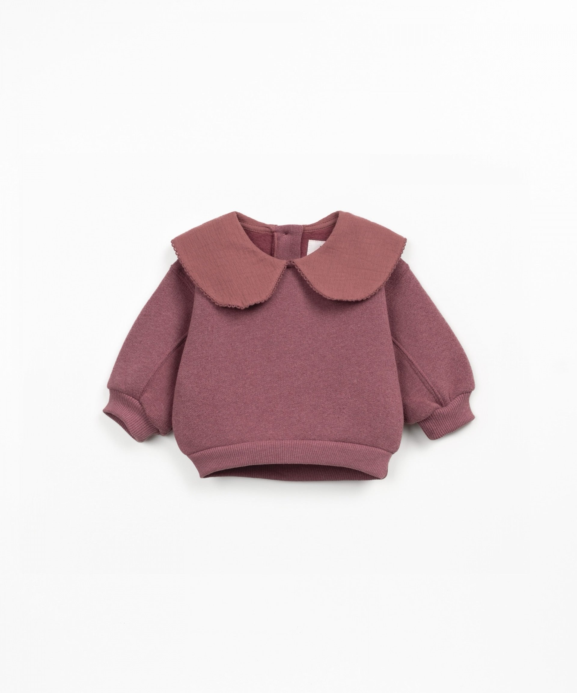 This fleece sweatshirt is made of knit fabric with a blend of cotton, recycled cotton, and recycled polyester, in Dark Pink color. It is a model with long sleeves, wide collar application, and back opening with coconut button.