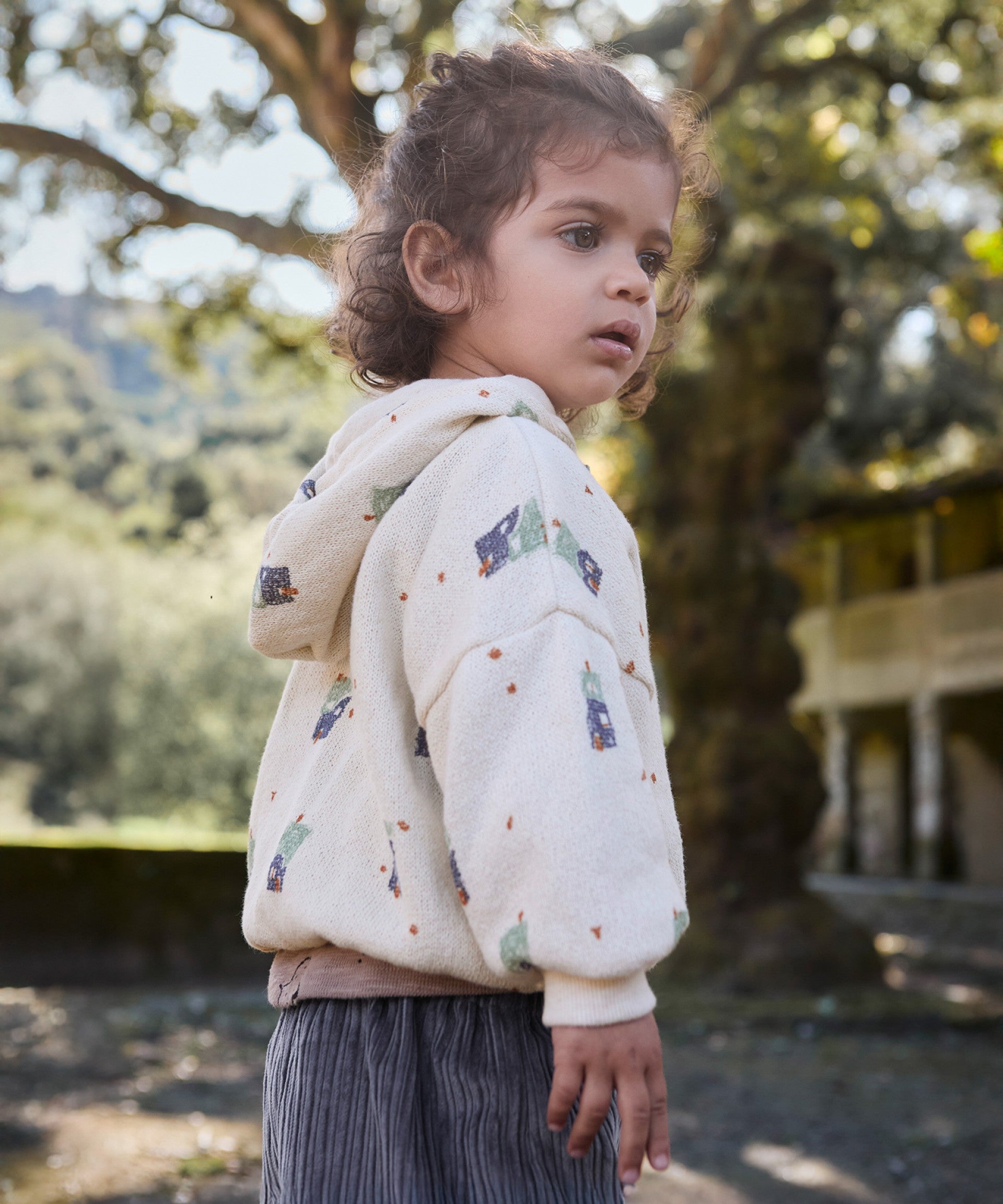 This jacket is made from knit fabric with a blend of regenerative cotton and recycled cotton, in the color Off White. It features a hood, long sleeves, front opening with coconut buttons, and a house print.