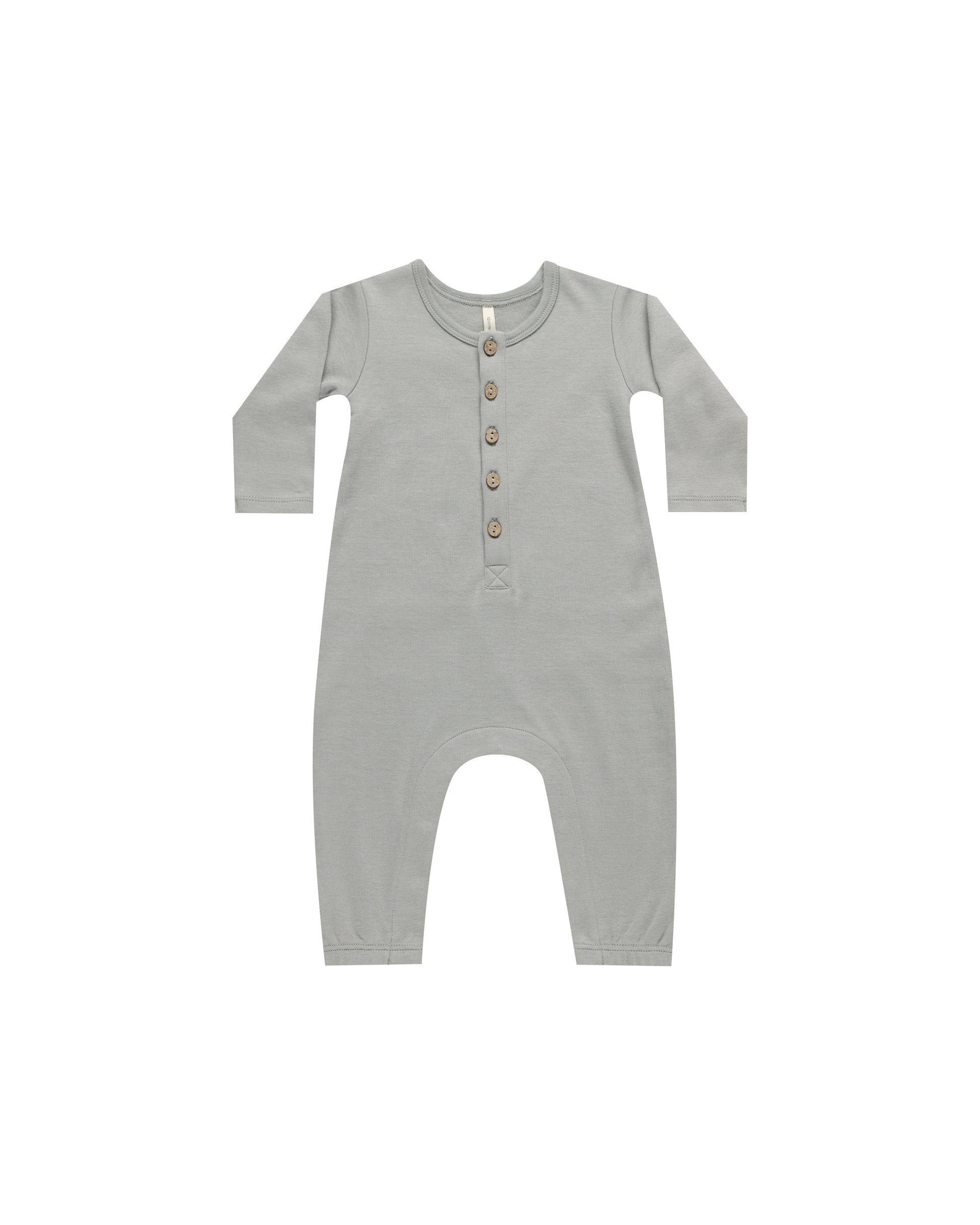 Velvety soft long sleeve jumpsuit with coconut buttons down the chest, and hidden snaps along the inseam for easy changing.