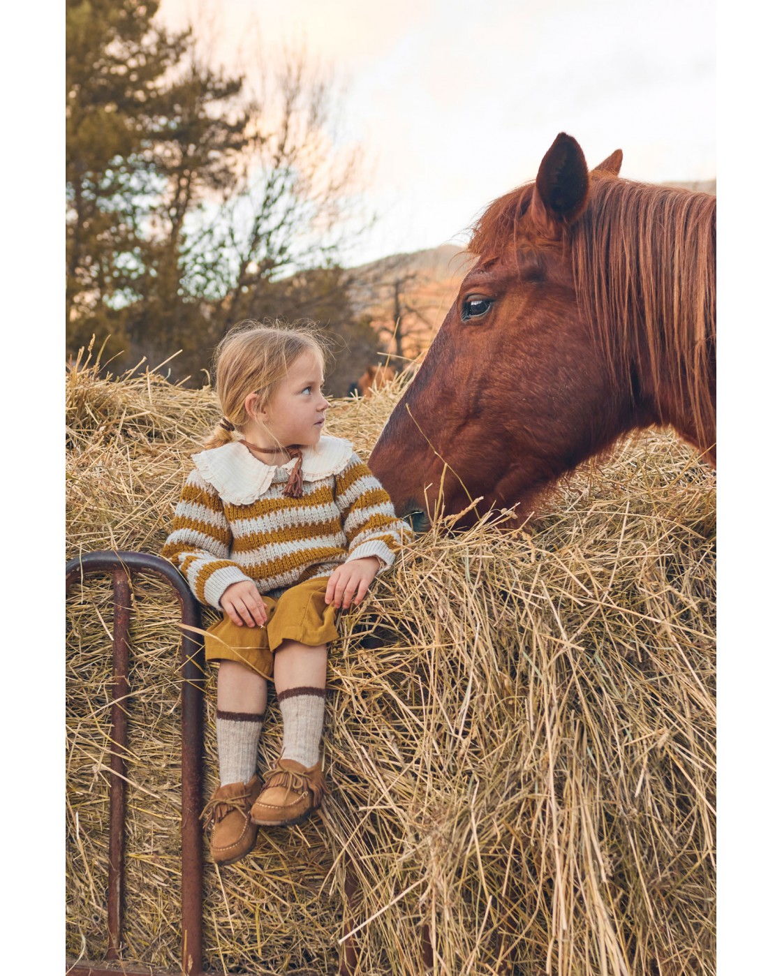 Double gauze with fine stripe lurex blouse. Ruffled turtleneck. Puffed long sleeves. Elastic cuffs with ruffle. Front button fastening.