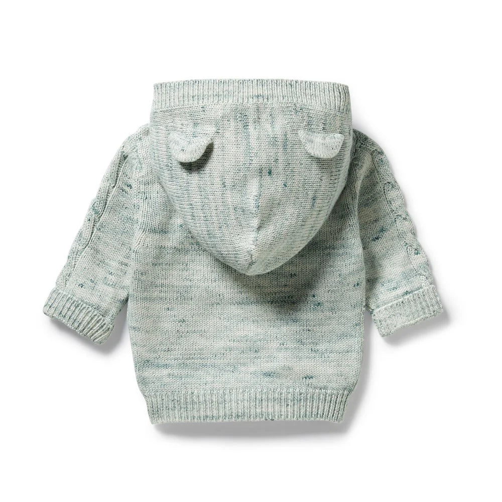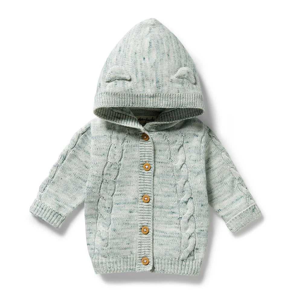 Introducing our cosy knitted jacket with a hood and adorable bear ears. Made of a luxurious blend of organic cotton, bamboo, and wool, this jacket features a button front opening and a cable design on the front. Stay warm this winter with our baby-friendly design.