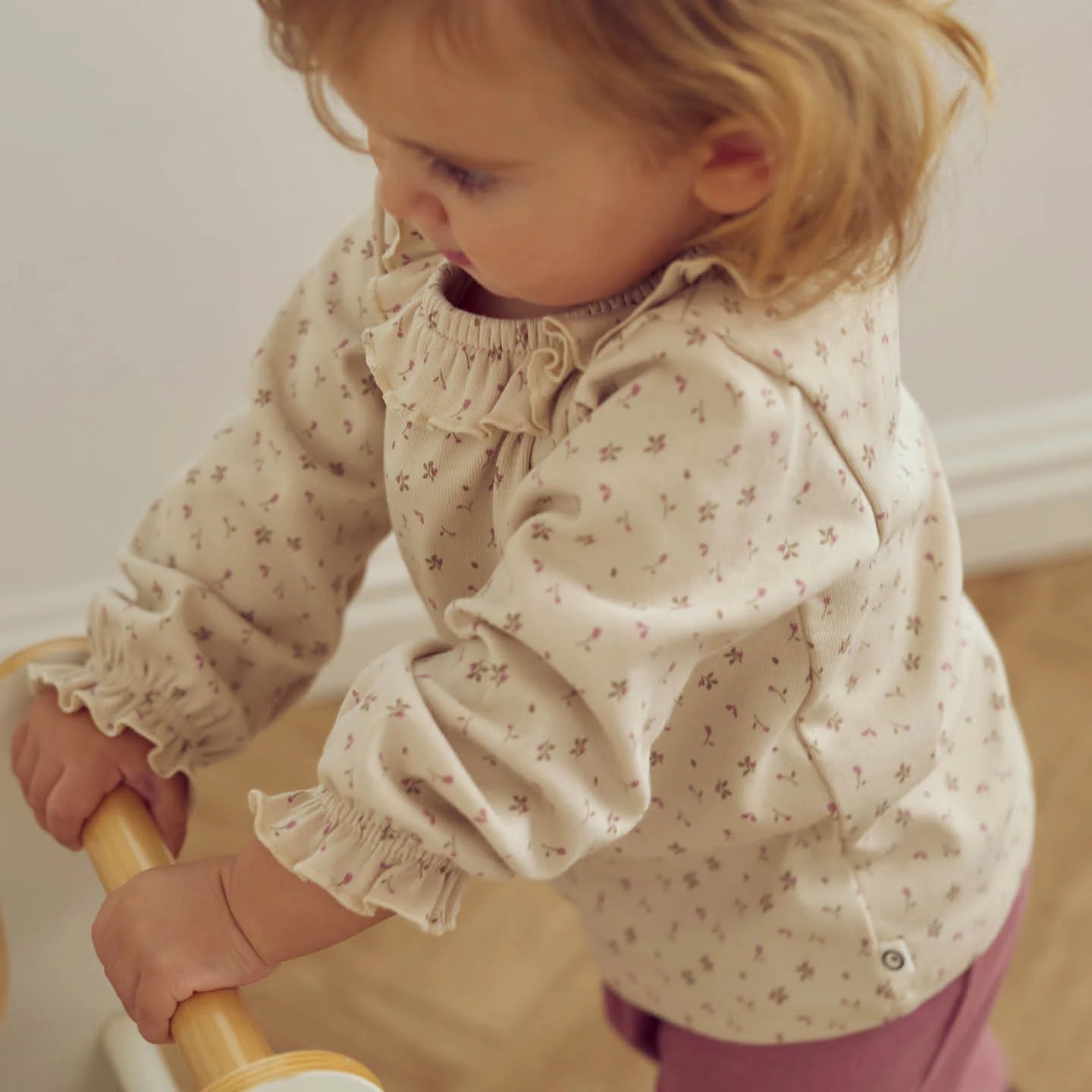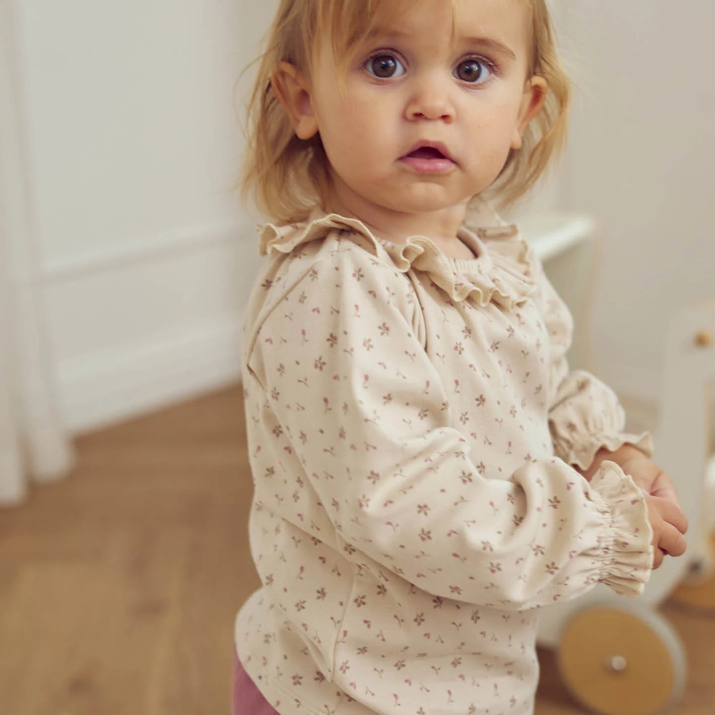 Beautiful top with long sleeves and with a cute all-over print of small sweet flowers.and with a decorative frill collar.