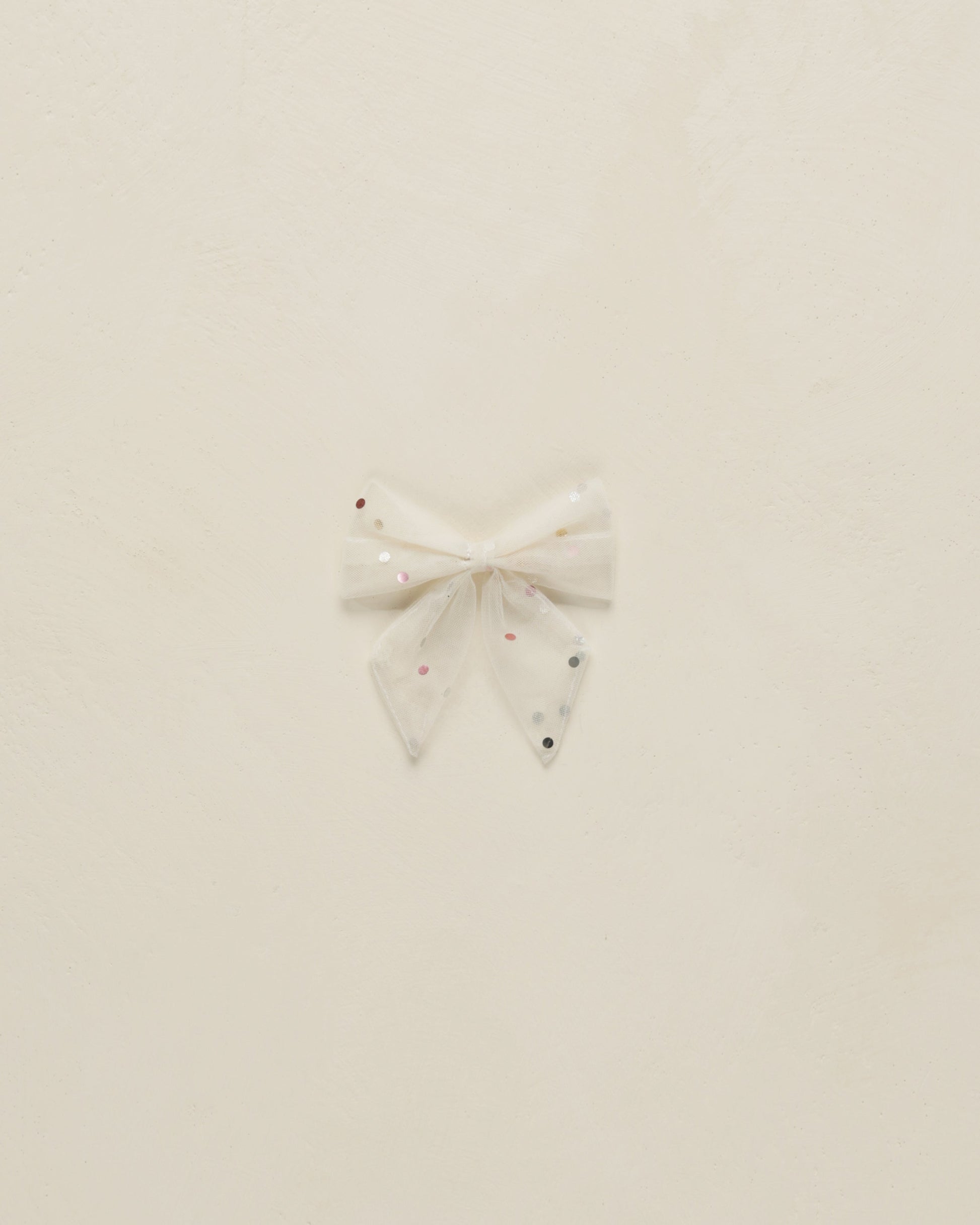 A sweet tulle bow attached to a rose gold alligator clip for easy wear.
