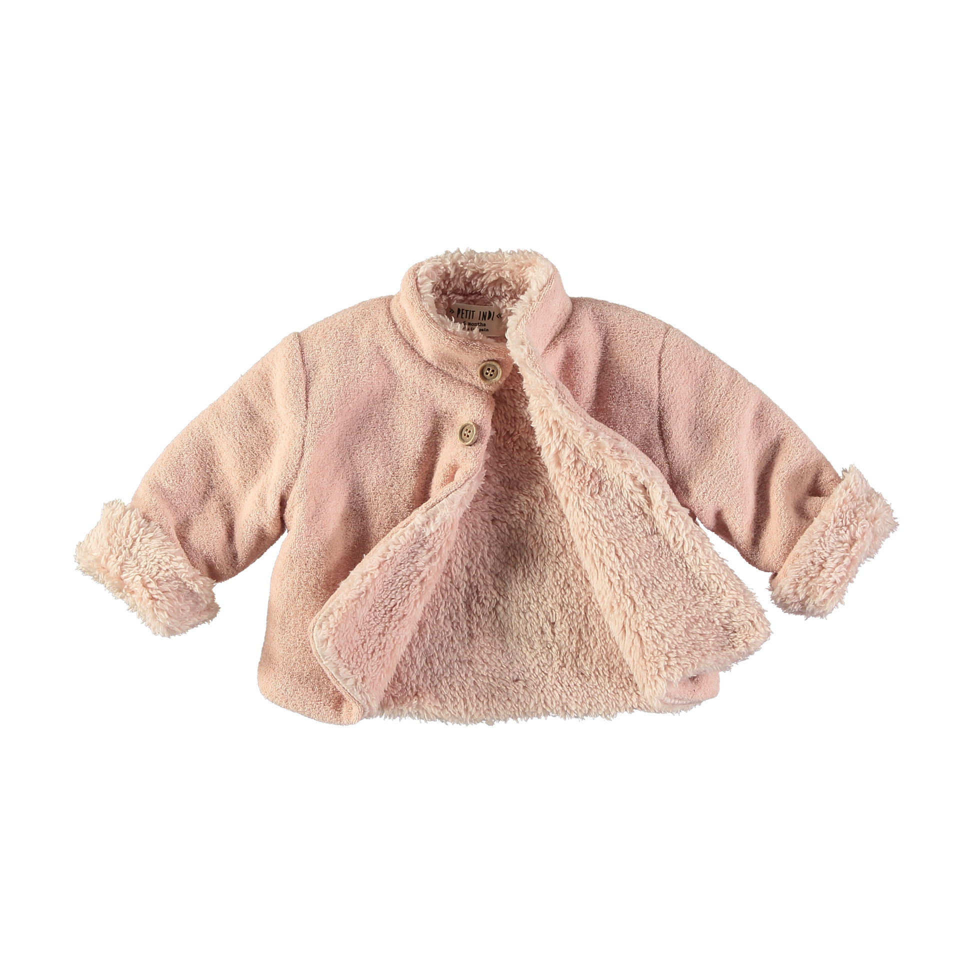 Soft, sweet, and irresistibly cozy — this blush pink faux fur coat from Petit Indi is the perfect layer for chilly days. Designed with a plush, teddy-style texture and a warm lining throughout, it features a classic round neckline, button closures, and roll-up cuffs for an extra touch of charm. A timeless piece for little wardrobes that pairs beautifully with dresses, bloomers, or everyday outfits.
