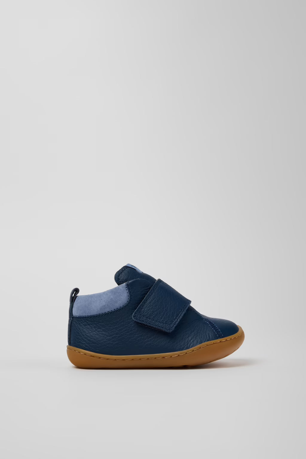 Blue calfskin leather and nubuck kids' ankle boots with an EVA removable footbed, hook & loop system and recycled rubber outsoles (20% recycled).