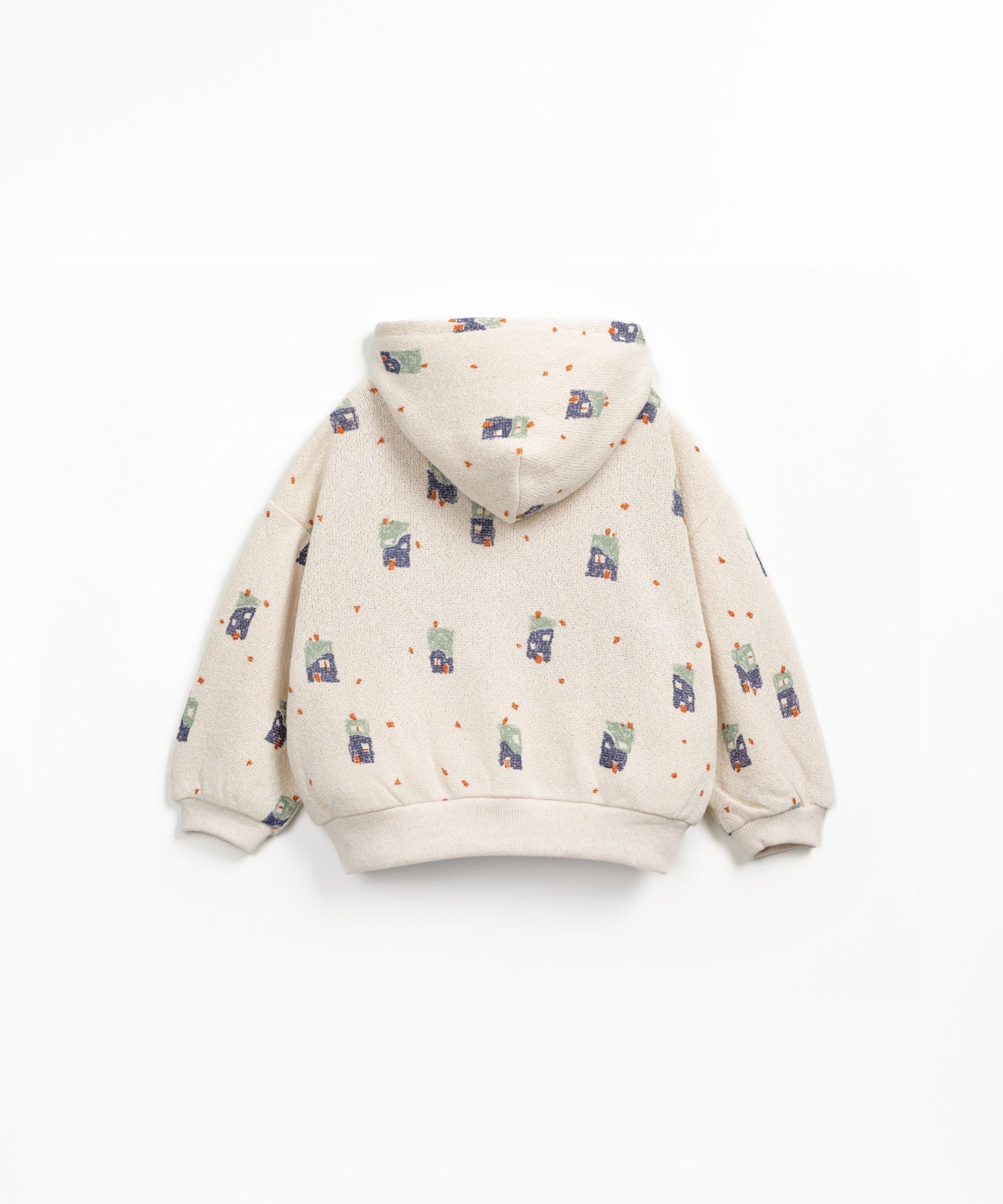 This sweatshirt is made of jersey knit with a blend of regenerative cotton and recycled cotton, in off white color. It features a hood, a kangaroo pocket, elastic at the sleeve openings and hem, and our houses print.