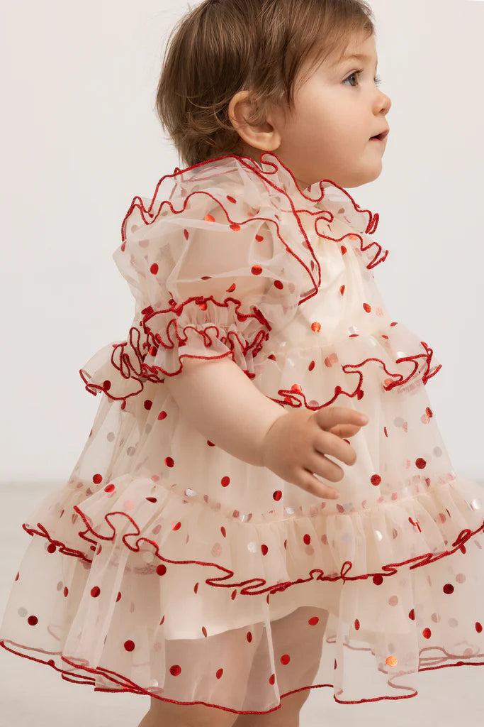 Short-sleeved dress with many layers of tulle for volume. The dress has beautiful red metallic dots, a nice round collar with tulle ruffles and contrast edging. The length of the dress goes above the knees.
