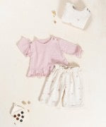 These trousers are made from jersey fabric with a blend of regenerative cotton and recycled cotton, in the color Off White. The model features an elastic waistband, wide legs, and our flower print.