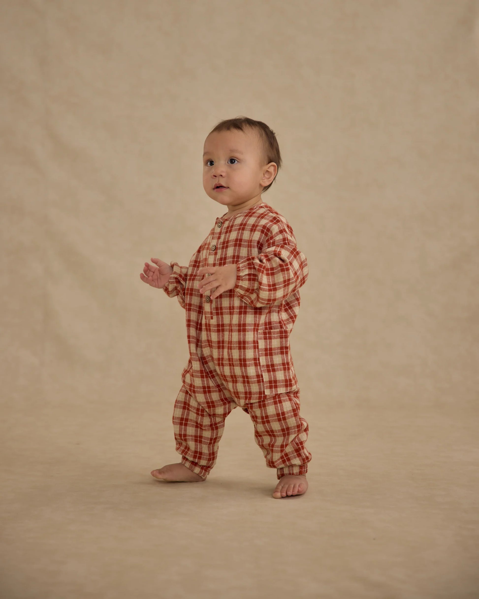 Our corduroy jumpsuit features coconut buttons at the center front and snaps along the inseam to create a bubble-like silhouette. It also has pockets at the side seams.