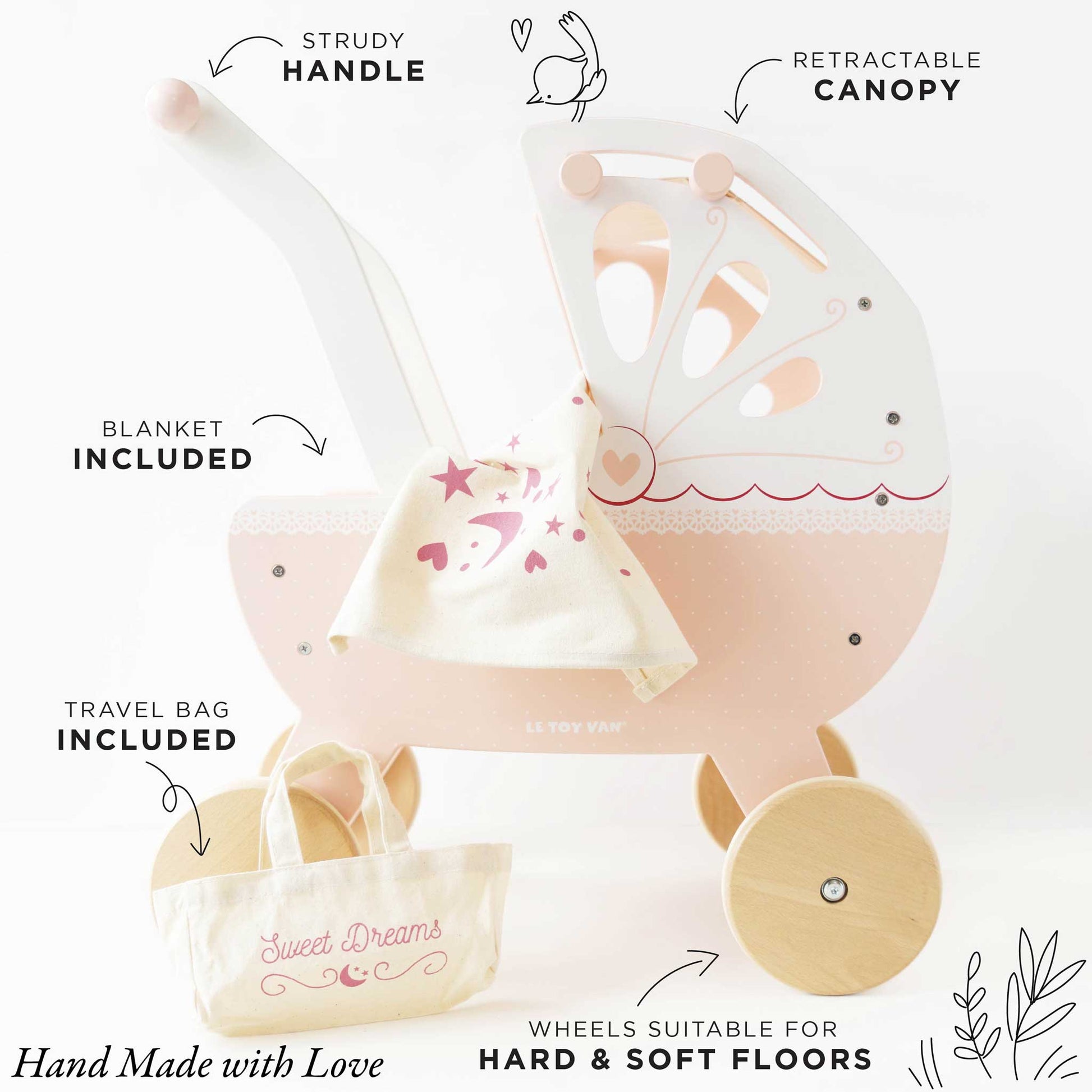 Take dolly out and about on adventures with our beautiful, traditional wooden pram. This stroller has a strong structure with a soft mattress and unique retractable hand-sewn canopy, making it the perfect toy to take soft toys and dolls out in style! Featuring a soft pastel pink, cream and fresh white color palette, this pram comes complete with a cute, handmade removable changing bag. Develop early learning skills and promotes creative imagination, speech and social development. Perfectly complements our high chair and cot. Scaled for dolls and soft toys between 30-35cm.