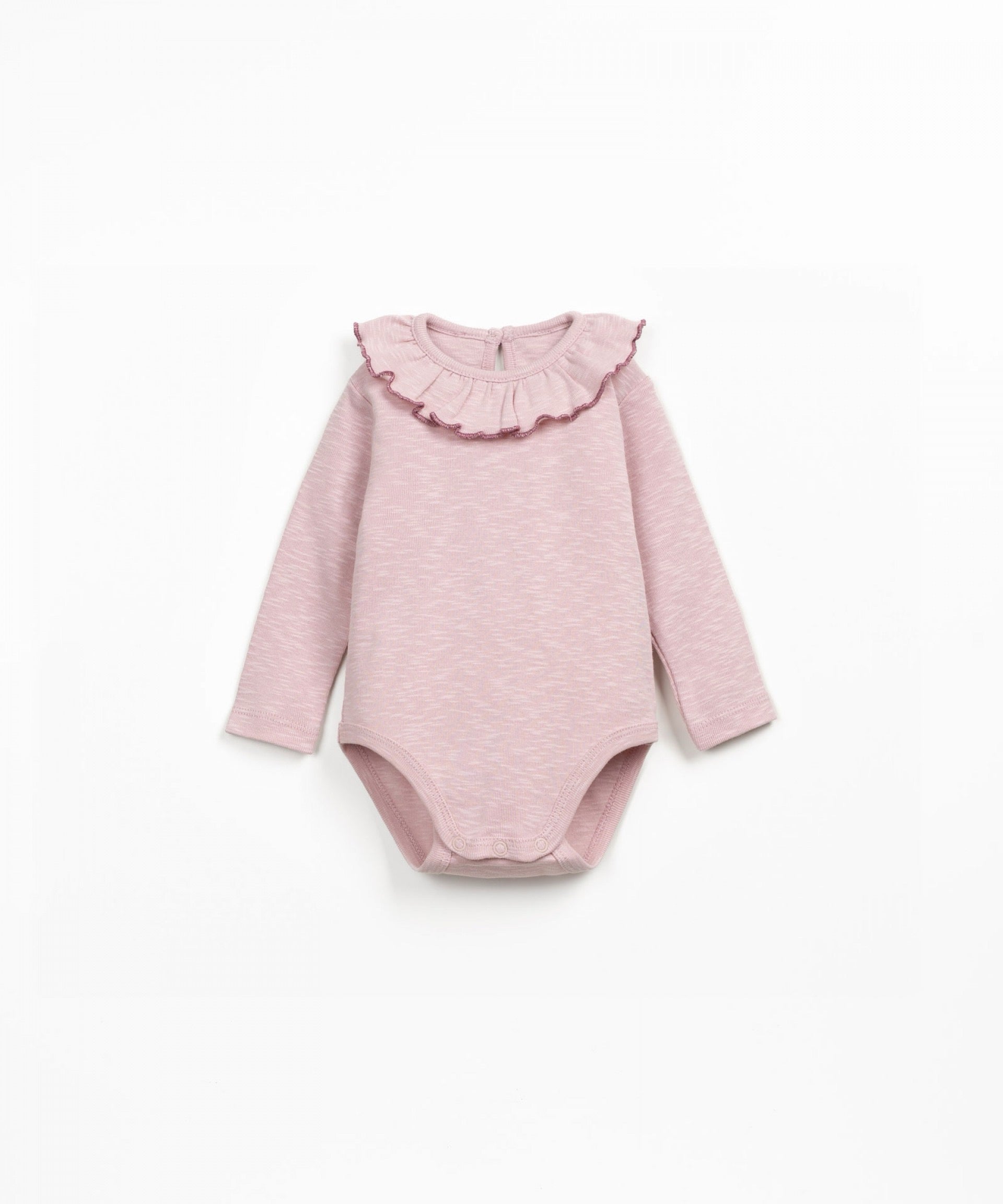This bodysuit is made of organic cotton jersey, in Light Pink color. It features long sleeves, a frilled collar, and a snap-button opening at the inseam with nickel-free metal buttons.