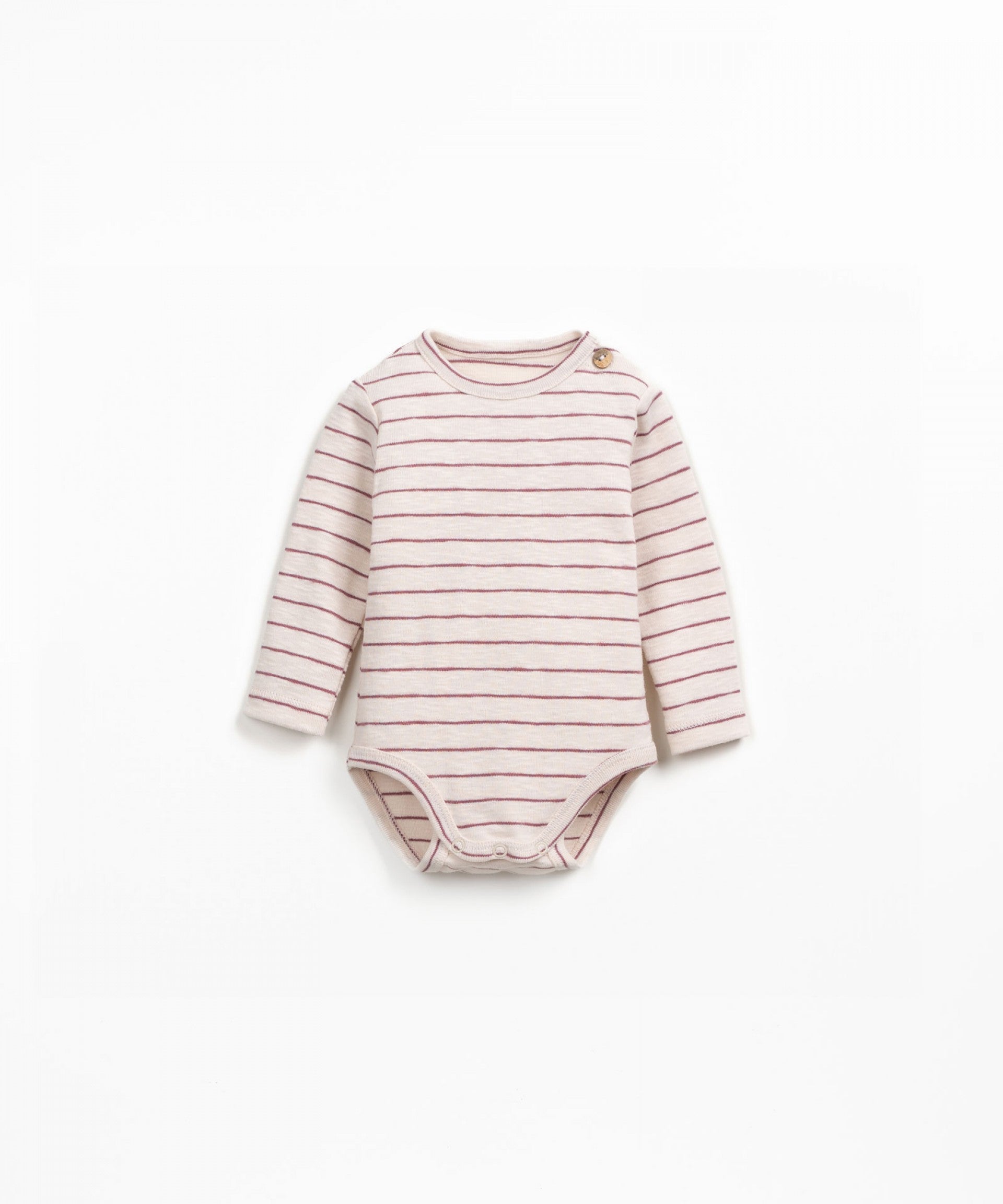 These leggings are made from organic cotton jersey, in Dark Pink color. They feature braces, integrated feet, and a front opening with coconut buttons. The bodysuit is made of organic cotton jersey, with stripes in Dark Pink. It features long sleeves, a round neckline, a coconut button opening at the shoulder, and a nickel-free metal snap fastening between the legs, with our signature stripe pattern.