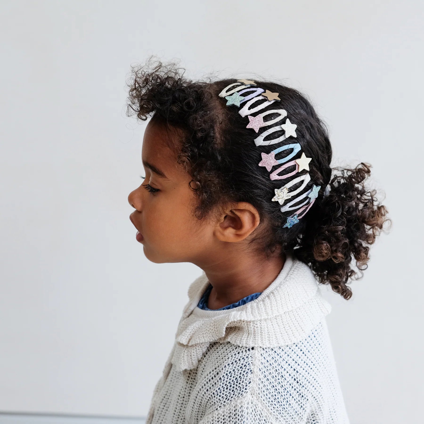 Twinkle twinkle little star! A sparkly pack of mini clips in a beautifully neutral palette sure to compliment any outfit! Perfect for little ones with thinner hair!