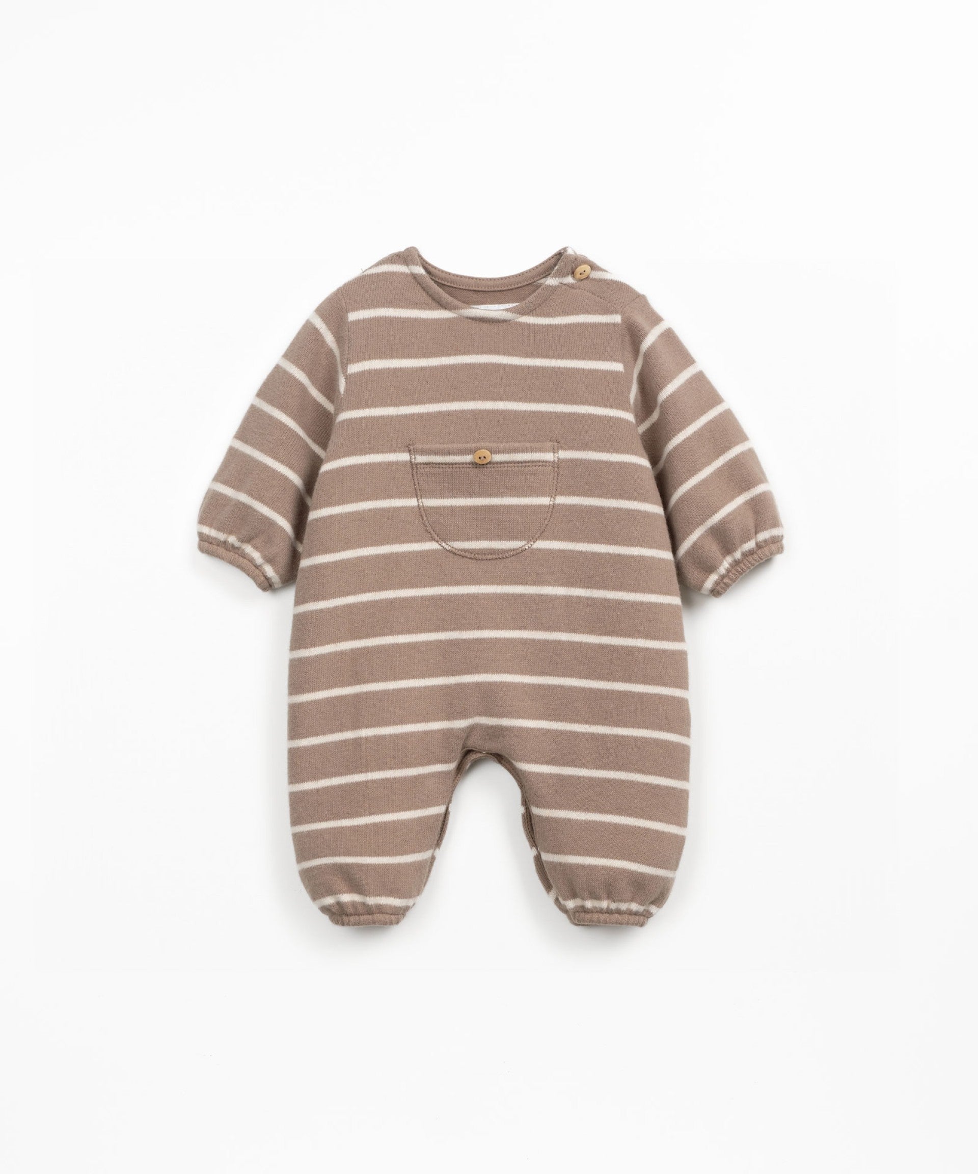 This jumpsuit is made of jersey fabric with a blend of regenerative cotton and recycled cotton, in Off White color. It is a long model with light brushing on the inside, shoulder opening with wooden button, snap fasteners between the legs made of nickel-free metal, elastic on the leg and arm openings, and a front pocket.