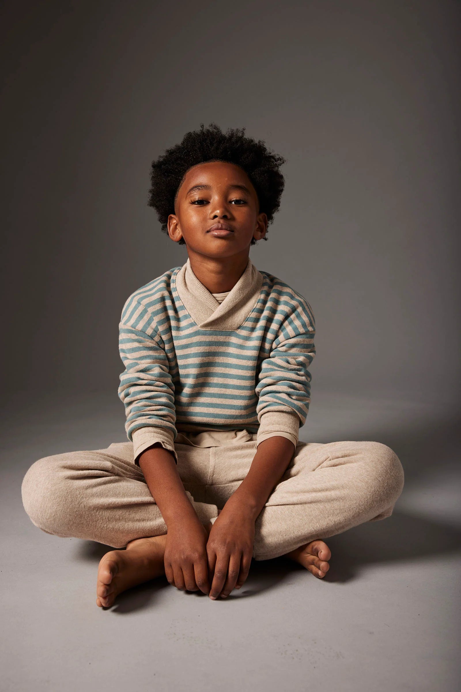 Striped sweater for kids crafted from soft knit, brushed inside and out for added warmth and a pleasant feel against the skin. It features a wrap-over collar for a cozy fit and easy layering, with ribbed trims at the neck, cuffs, and hem in a solid contrast color. Designed for comfort and everyday wear on cooler days.