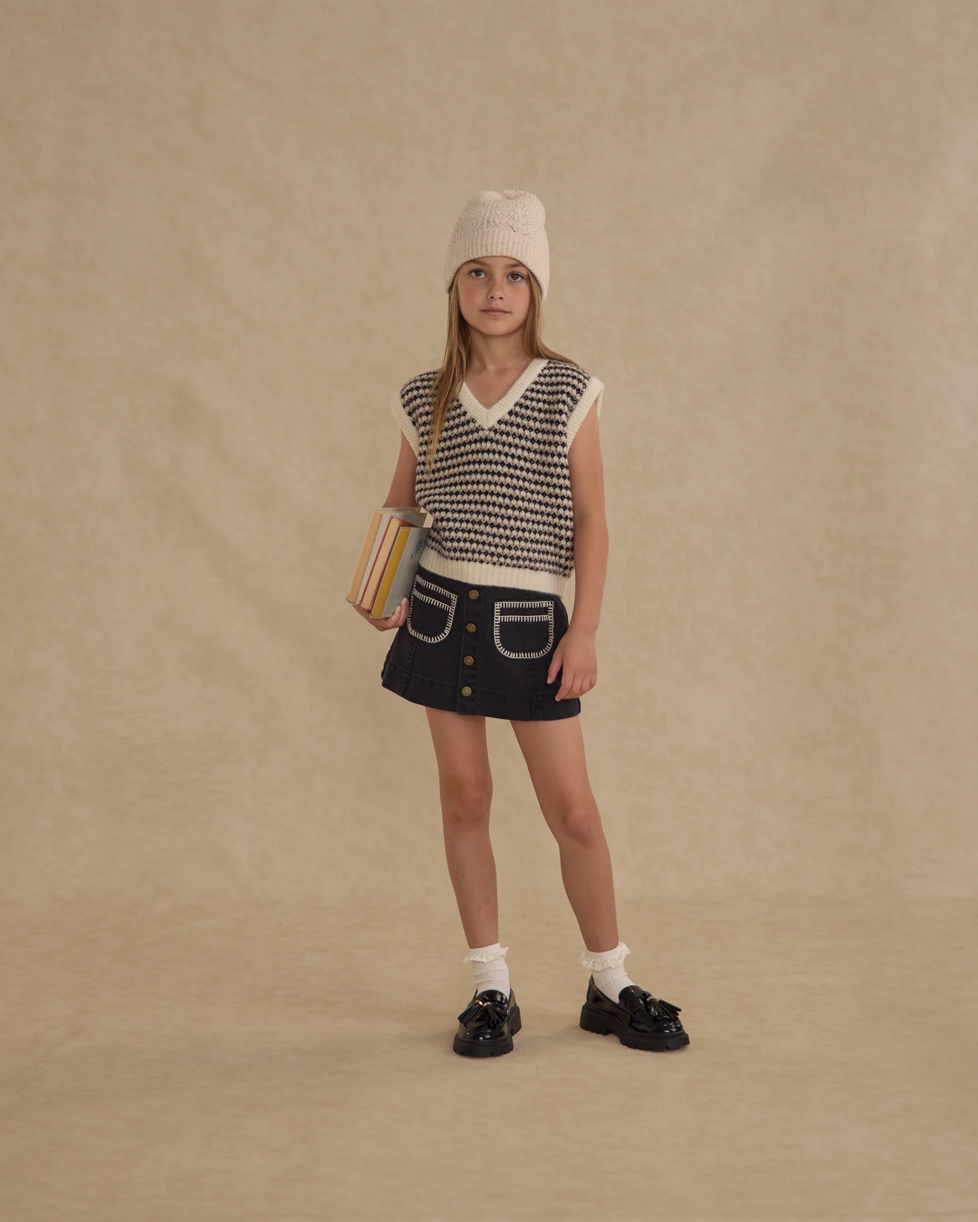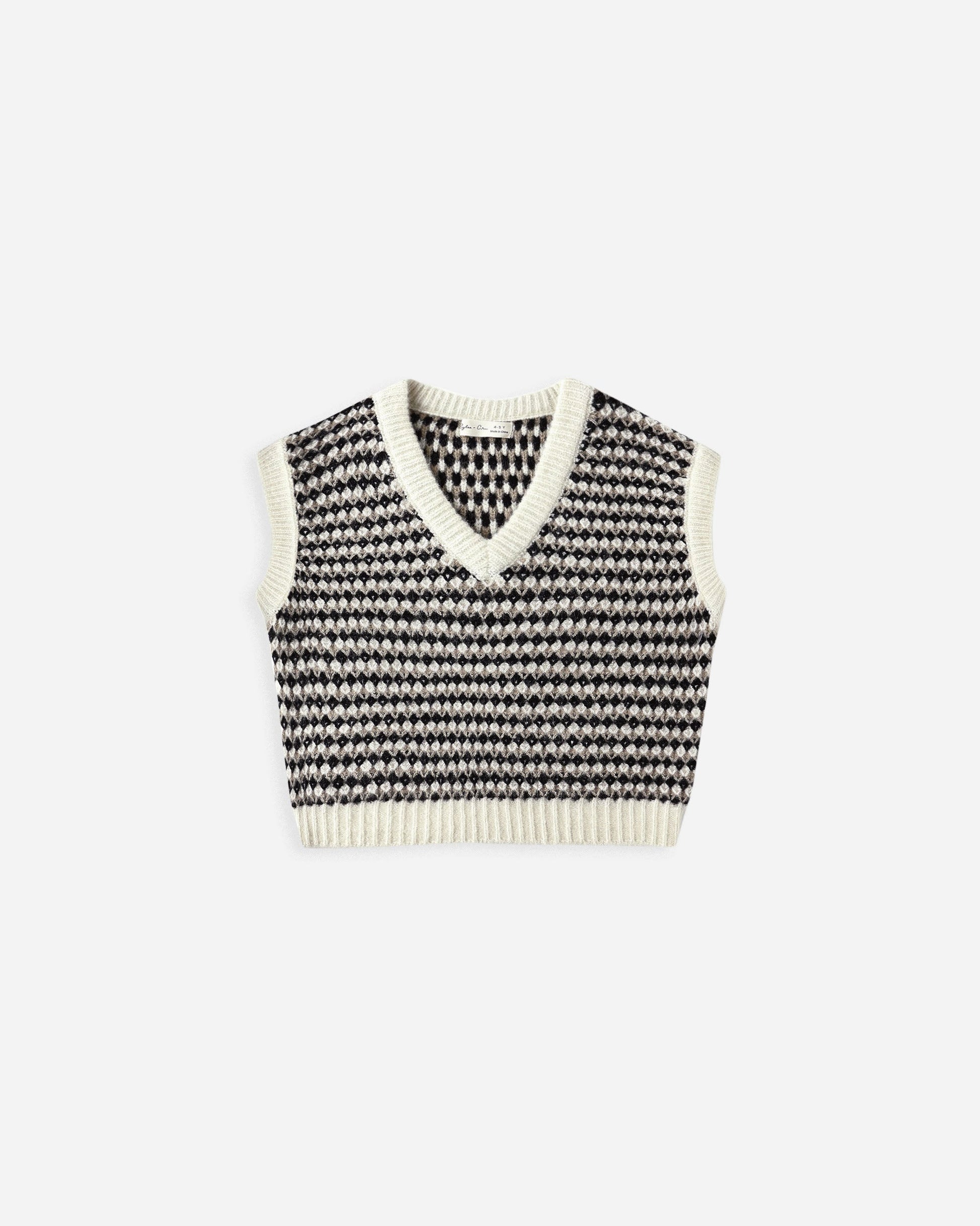 This preppy, boxy-fit Sweater Vest features a classic v-neckline, dropped shoulders, and ribbed trim at the hems for a vintage look.