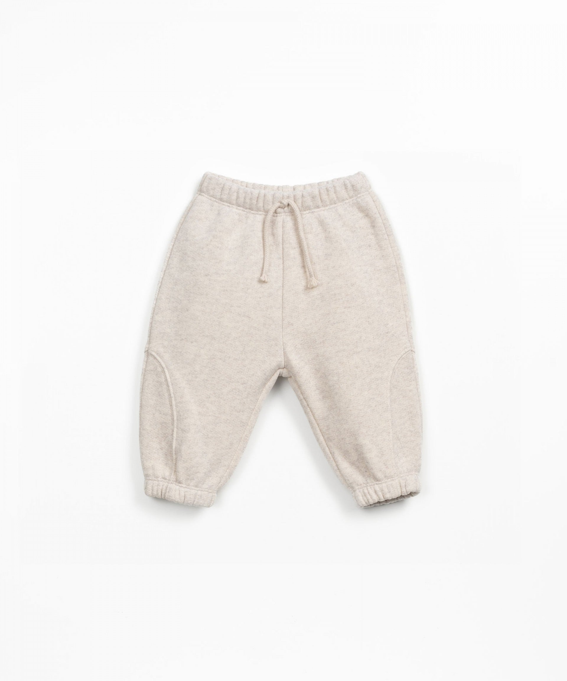 This fleece sweatshirt is made of a knit blend of cotton, recycled cotton, and recycled polyester, in Ecru color. It features a round neckline, elastic cuffs and waistband, and a shoulder opening with coconut buttons. The fleece trousers are made from a blend of cotton, recycled cotton and recycled polyester, in the color Raw. They are designed with elastic at the cuffs and waistband, and feature a decorative drawstring.
