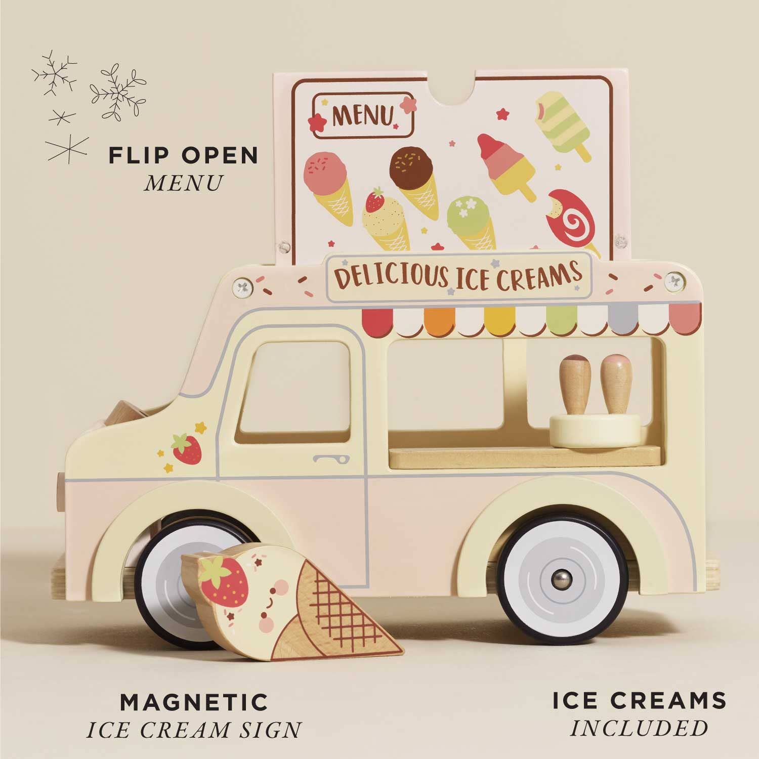 Roll up, roll up! Playtime doesn't get much sweeter than this classic miniature doll-sized ice cream van! This vintage-style ice cream truck is brimming with nostalgic charm. Complete with a whole host of interactive features, including a set of fun stickers to personalize, a lift-up roof and a sweet serving window, all designed for role play fun. Compatible with all of our dolls, dolls houses and accessories collection. Suitable for all figurines around 10cm.